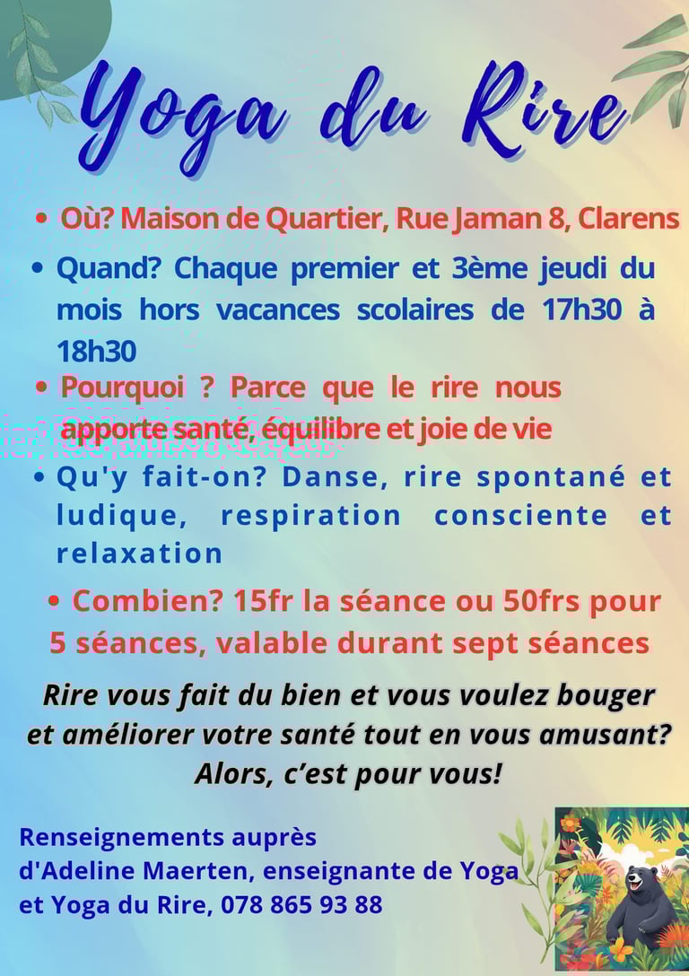 Au cœur de Montreux, Yogarmonie mêle yoga et rire pour apaiser corps et esprit. Venez vivre des moments de joie partagée et de pleine conscience.